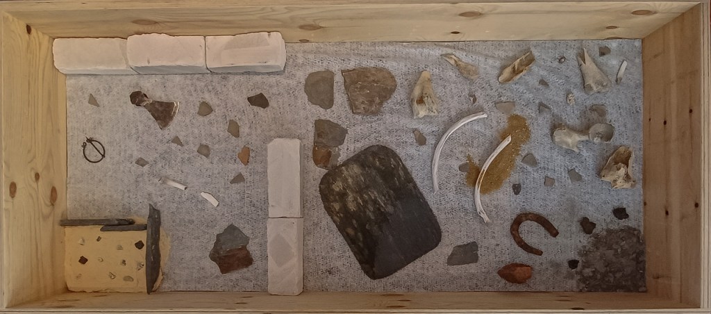 Ici, cela sera fait par le biais de la mise à disposition de vestiges archéologiques de ces deux périodes. Les archéologues amateurs retrouvent dans ces bacs : des ossements, des objets métalliques tels que des parures ou de la monnaie, mais aussi de la céramique des différentes époques. Le but est alors de comparer ces objets gaulois et médiévaux, mais surtout de laisser libre court à son imagination afin de replacer ceux-ci dans le contexte de l’époque. À quoi pouvaient servir ces fragments de pierre, de lauze, cette fibule ? Les enfants interprètent ce qu’ils fouillent et déduisent la façon dont étaient fabriqués les habitats de cette époque.